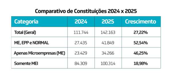 O grande destaque do balanço, no entanto, é o salto nas categorias que exigem maior estruturação jurídica e contábil. Enquanto o número de Microempreendedores Individuais (MEIs) apresentou um crescimento de 18,98%, as empresas que não se enquadram nesse regime (ME, EPP e Normal) tiveram uma alta de 52,54%.