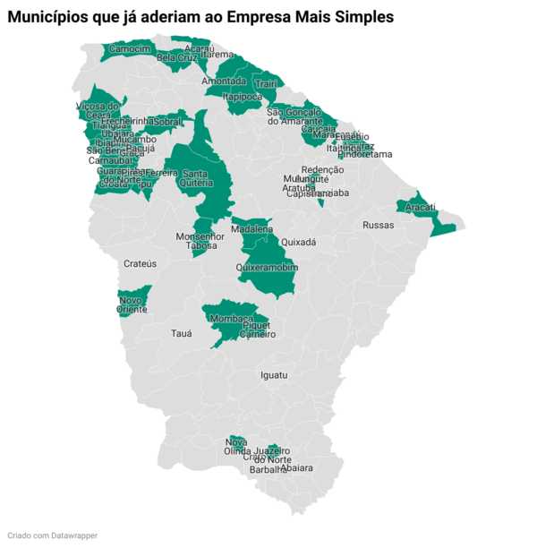 Desde seu lançamento em 2022, o Empresa Mais Simples já conta com 37 municípios do Ceará integrados ao Programa, oferecendo aos seus cidadãos acesso ao registro de empresas em minutos. São estes: Acaraú, Amontada, Aquiraz, Aracati, Baturité, Bela Cruz, Camocim, Caucaia, Carnaubal, Croatá, Eusébio, Frecheirinha, Guaraciaba do Norte, Graça, Ibiapina, Ipu, Itaitinga, Itapipoca, Juazeiro do Norte, Madalena, Maracanaú, Mombaça, Monsenhor Tabosa, Mucambo, Nova Olinda, Novo Oriente, Pacujá, Pires Ferreira, Piquet Carneiro, Pindoretama, Quixeramobim, Santa Quitéria, São Gonçalo do Amarante, São Benedito, Sobral, Tianguá, Trairi, Ubajara Viçosa do Ceará.